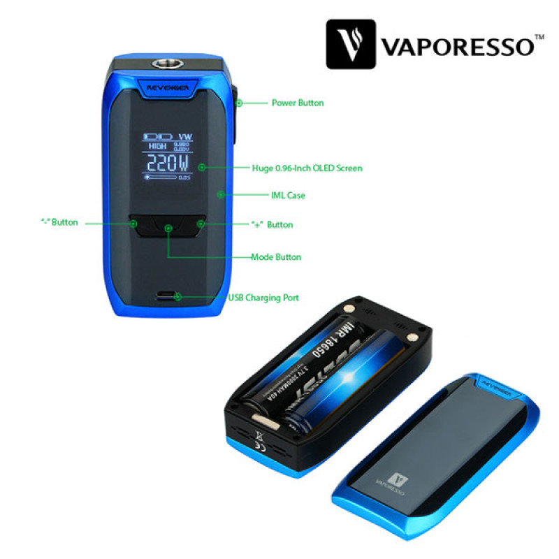 Vaporesso Revenger TC impreuna cu atomizorul NRG Mini, formeaza o tigara electronica extrem de puterica ce poate generea 220W . Mod-ul Revenger dispune de un ecran masiv de 0.96 inch si un sistem de incarcare rapida de 2.5A . Functia RCT ofera o modalitate precisa de a cunoaste timpul de incarcare. vaporizatorul NRG, areun design modern ce premite folosirea unui sistem slide-n-fill pentru incarcarea cu lichid, NRG Mini va aduce o aroma pura si o operare usoara pentru dvs. Revenger impreuna cu atomizorul NRG sunt o combinatie excelenta pentru a oferi o experienta excelenta de vaping.